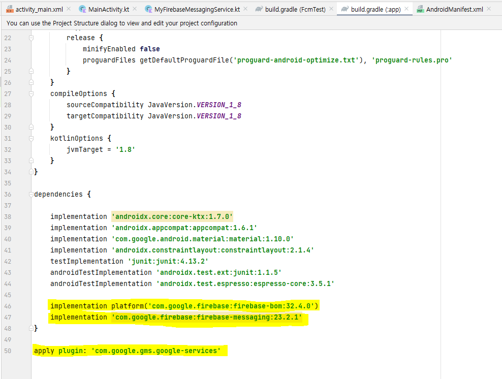 implementation 'com.google.firebase:firebase-messaging:23.2.1'