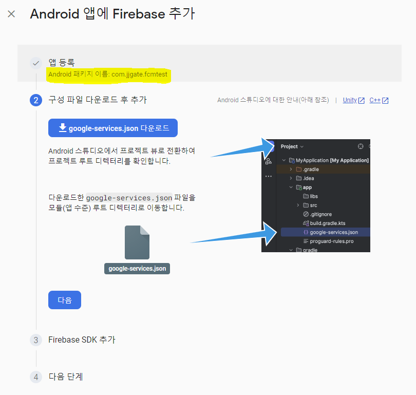 ※ 패키지 이름 android studio 에서 만든 프로젝트 이름과 동일해야함