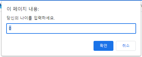 var age= prompt("input your age", "0"); //사용자 입력을 받아주는 다이얼로그
