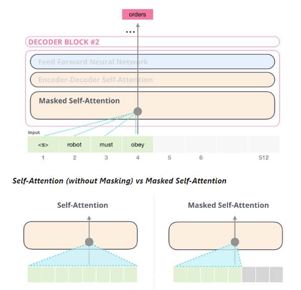 Masked Self-Attention은 디코더 블록에서 사용하기 위해서 마스킹 과정이 포함된 Self-Attention