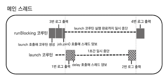 runBlocking 코루틴 입니다. launch 함수를 호출해 새로운 코루틴을 생성하지만 launch 코루틴이 생성 후에도 runBlocking 코루틴이 계속해서 메인 스레드를 점유하고 있고 launch 코루틴은 Dispatcher 내 작업 대기열에 적재된 상태로 머뭅니다. 여기에서 join 함수를 호출할 때 runBlocking은 메인 스레드를 양보하게 됩니다. launch 코루틴이 점유하게 됩니다. 이후 1번 로그를 출력하고 이어서 delay 일시 중단 함수를 호출해 메인 스레드를 양보합니다.launch 코루틴은 delay에 의한 일시 중단 시간 1초가 끝나고 재개 되며, 2번 로그를 출력하고 실행이 완료 됩니다.launch 코루틴의 실행이 완료되면 join에 의해 일시 중단된 runBlocking 코루틴은 재개돼 4번 로그를 출력하게 됩니다.