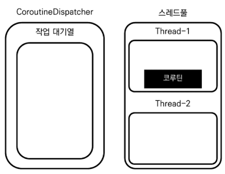 예를 들어 Thread-1 스레드와 Thread-2 스레드를 사용하는 CoroutineDispatcher 객체가 있고, 이 CoroutineDispatcher 객체에 실행 요청된 코루틴이 있다고 가정을 해보겠습니다.