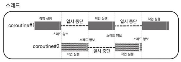 한 번 실행되면 실행이 완료될 때까지 스레드를 사용하는 서브루틴과 다르게 코루틴은 스레드 사용 권한을 양보하며 함께 실행 됩니다.코루틴은 서로 간에 협력적으로 동작한다고도 합니다. 코루틴이 협력적으로 동작하기 위해서는 코루틴이 작업을 하지 않는 시점에 스레드 사용 권한을 양보하고 일시 중단해야 합니다.