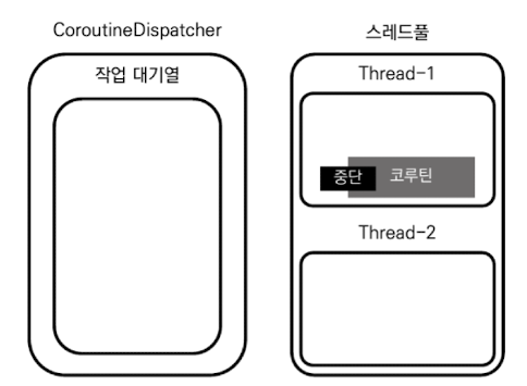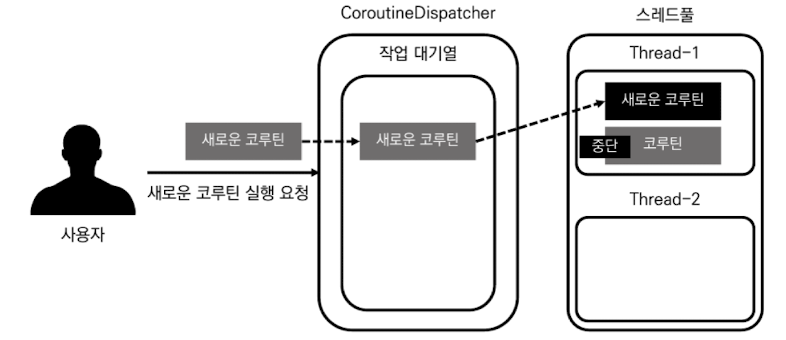 기존 코루틴이 일시 중단된 상황에서 새로운 코루틴이 CoroutineDispatcher 객체에 실행 요청될 경우 CoroutineDispatcher 객체의 작업대기열로 이동한 후 새로운 코루틴을 Thread-1 스레드에 보내 실행될 수 있습니다.