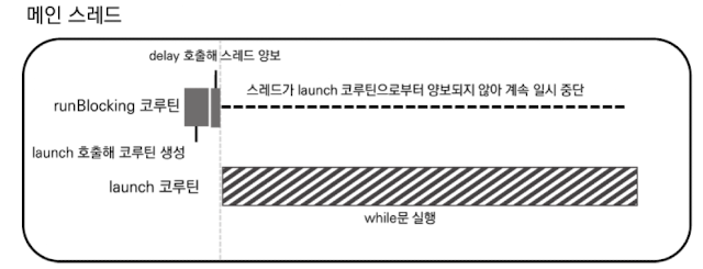 위 그림과 같이 runBlocking 코루틴(corutine#1) 과 launch 코루틴(corutine#2)이 자신의 작업을 실행하고 스레드를 양보하는 작업을 반복하는 것을 볼 수 있습니다.