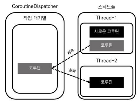 기존 일시 중단됐던 코루틴이 재개되면 다시 CoroutineDispatcher 객체의 작업 대기열로 이동하며, CoroutineDispatcher 객체에 의해 스레드로 보내져 실행됩니다. Thread-1 스레드에서는 이미 새로운 코루틴이 실행되고 있으므로 재개된 코루틴은 남은 스레드인 Thread-2 스레드로 보내집니다.