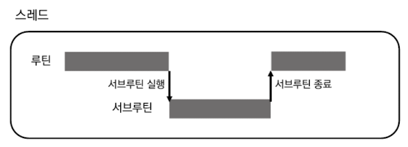 서브루틴은 한 번 호출되면 끝까지 실행 됩니다. 따라서 루틴에 의해 서브루틴이 호출되면 루틴을 실행하던 스레드는 서브루틴을 실행하는 데 사용돼 서브루틴의 실행이 완료될 때까지 루틴은 다른 작업을 할 수 없습니다.