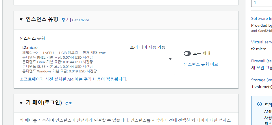 성능 사양을 선택한다. 프리 티어에서는 t2.micro만 사용가능하므로 이를 선택하고 세부 정보 구성을 선택한다.