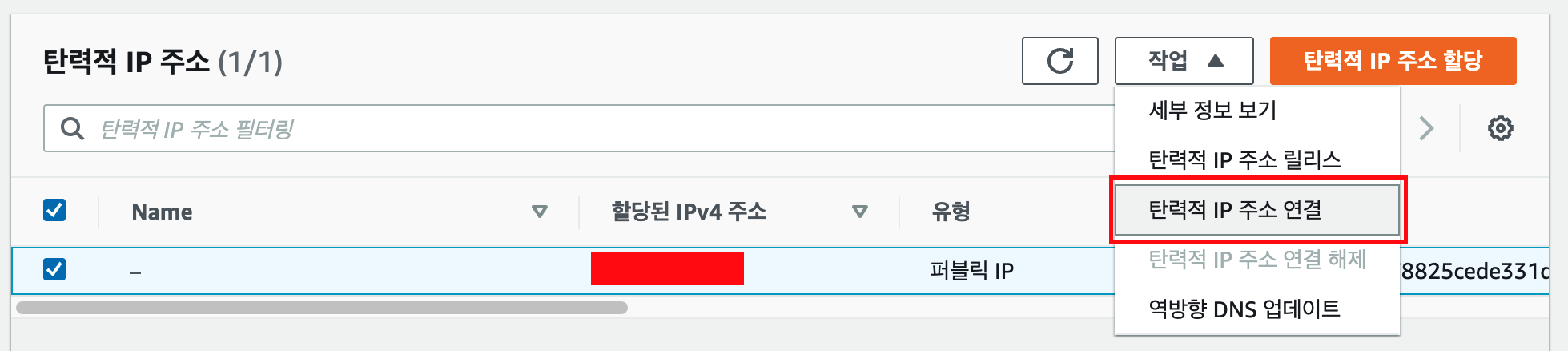 할당된 ip를 선택하고 작업 -> 탄력적 ip 주소 연결을 선택한다.