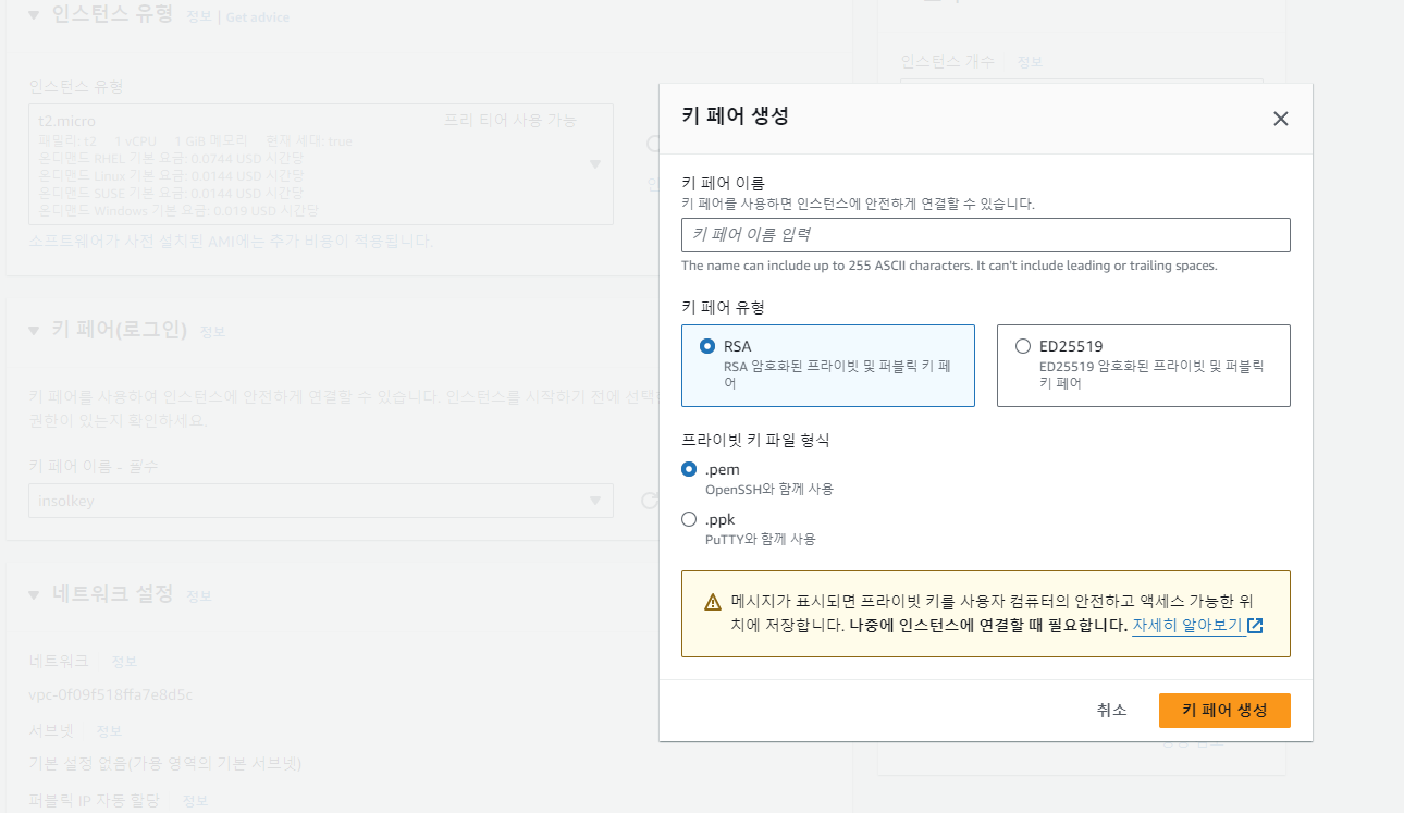 그리고 바로 아래에 키페어를 생성한다 이건 내 서버컴퓨터에 ssh로 접속할때 쓰는 인증키와 같다