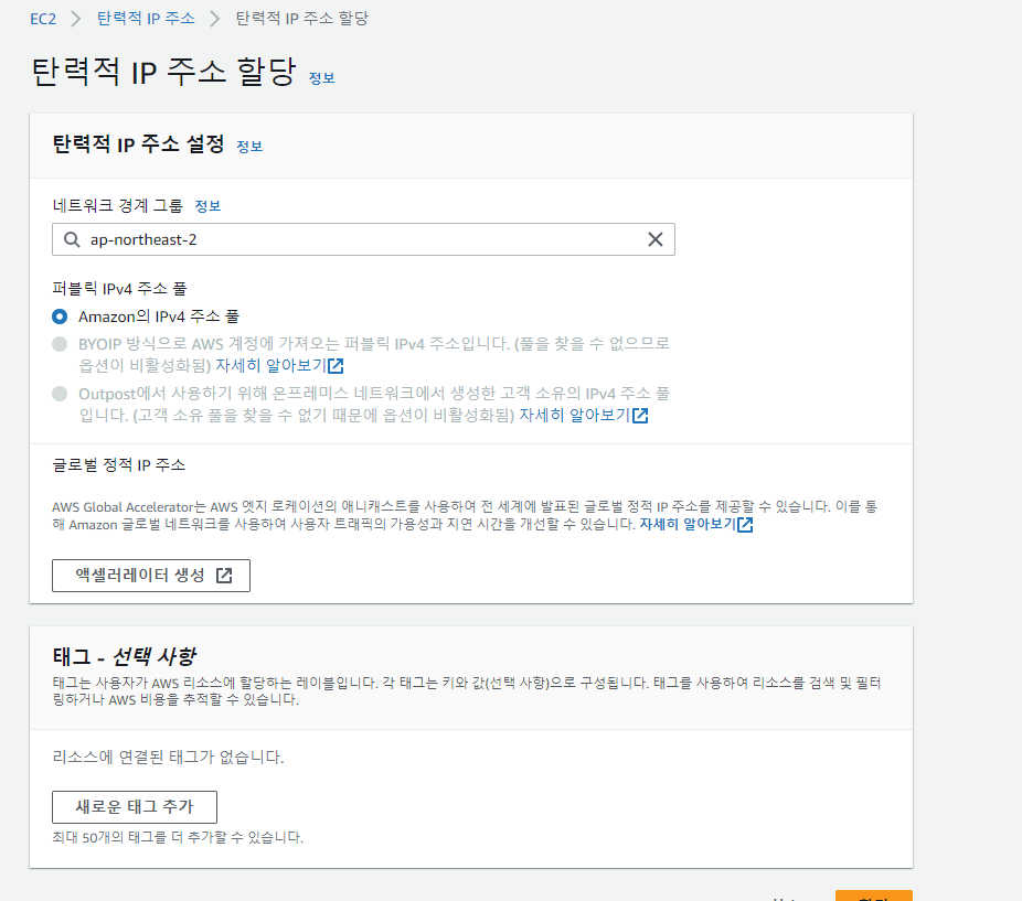 추가로 탄력적ip를 생성해서 연결시켜준다. 이것을 안하면 내 서버 컴퓨터의 ip가 바뀌기때문에