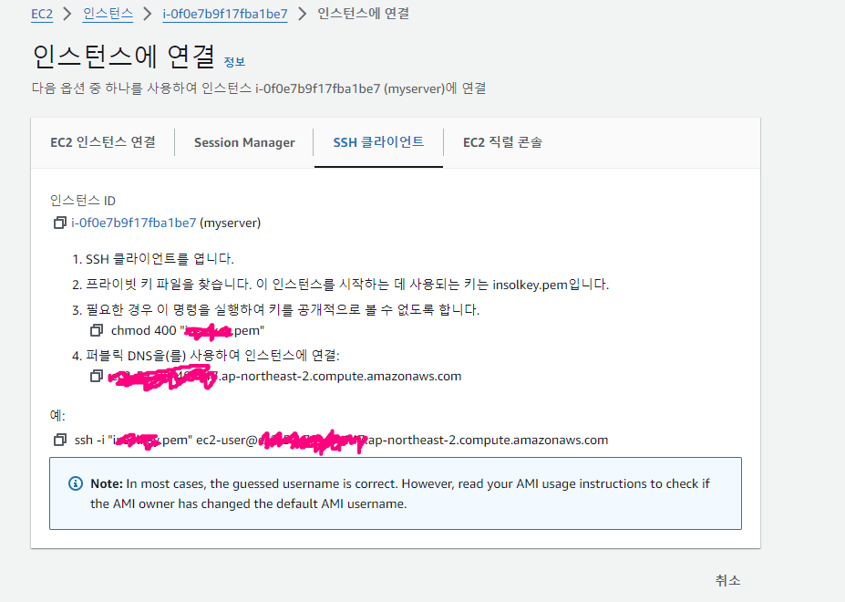 그럼 이런 화면이 보일것이다 여기서 ssh클라이언트로 들어가면 내 로컬 cmd에서 접속할수있는 예가 나온다 저것을 복사해준다.그리고 아까 만들어뒀던 pem키 세팅후