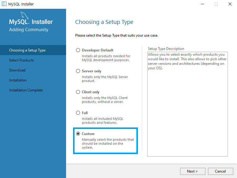 설치유형목록입니다 저희는 custom으로 필요한부문만 설치하려고합니다.