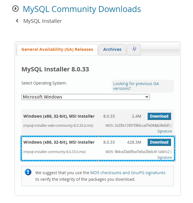 [MySQL Servers] – [MySQL Server] – [MySQL Server 8.0] – [MySQL Server 8.0.33 – X64]