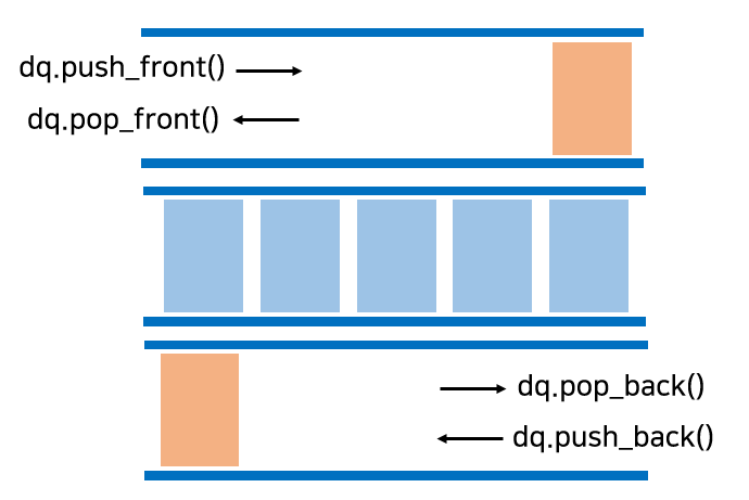 queue는 front에서만 삭제하고, end에서만 삽입하는데, deque는 front와 end에서 삭제와 삽입이 모두 가능하다.