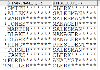 SELECT RPAD(ename,12,'*'), RPAD(job,12,'*')