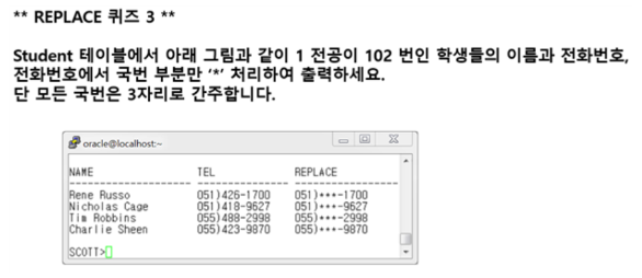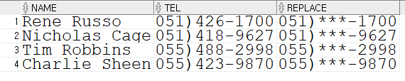 SELECT name, tel, REPLACE(tel, SUBSTR(tel, INSTR(tel,')',1)+1,3), '***') "REPLACE"