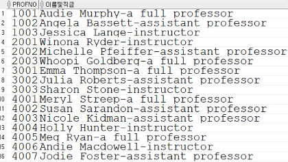 SELECT profno, CONCAT(CONCAT(name,'-'), position) "이름및직급"