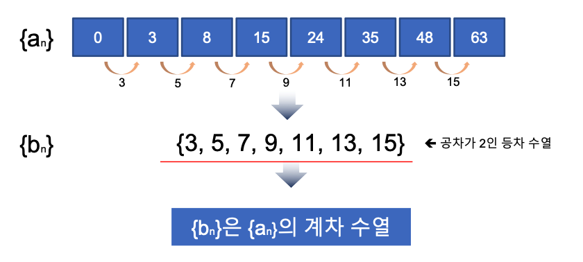 - 계차 수열을 이용해서 수열의 일반항을 구할 수 있다.