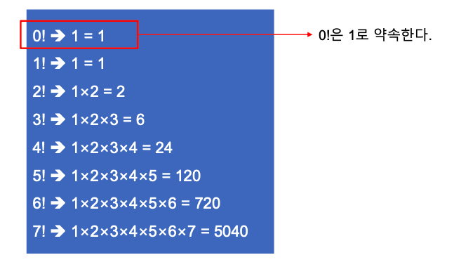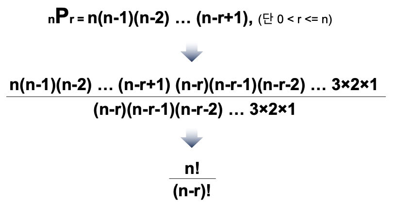 - 순열은 팩토리얼(계승)을 이용해서 나타낼 수 있다.