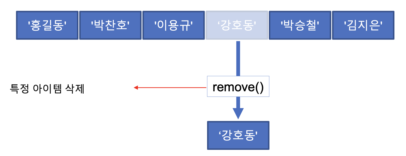 - remove() 함수를 이용하면 특정 아이템을 삭제할 수 있다.