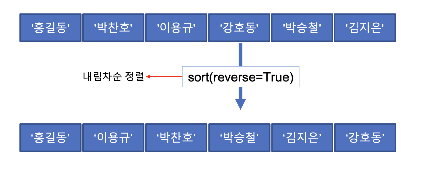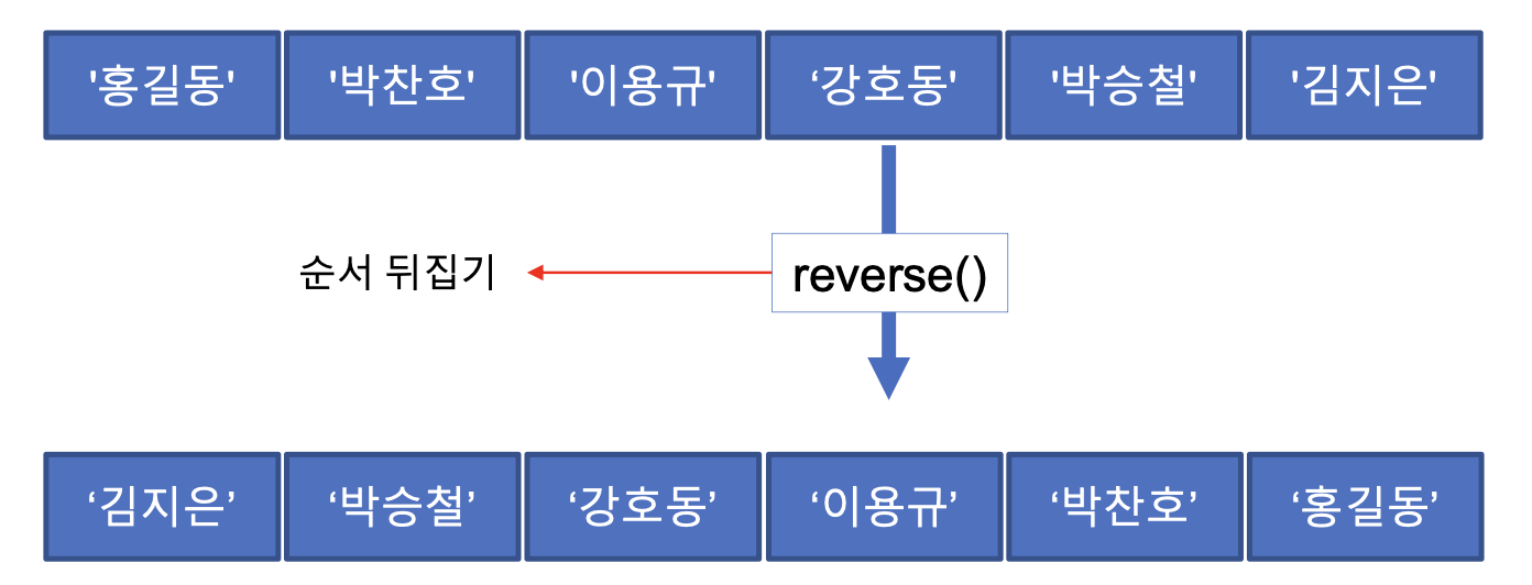 - reverse() 함수를 이용하면 아이템을 순서를 뒤집을 수 있다.