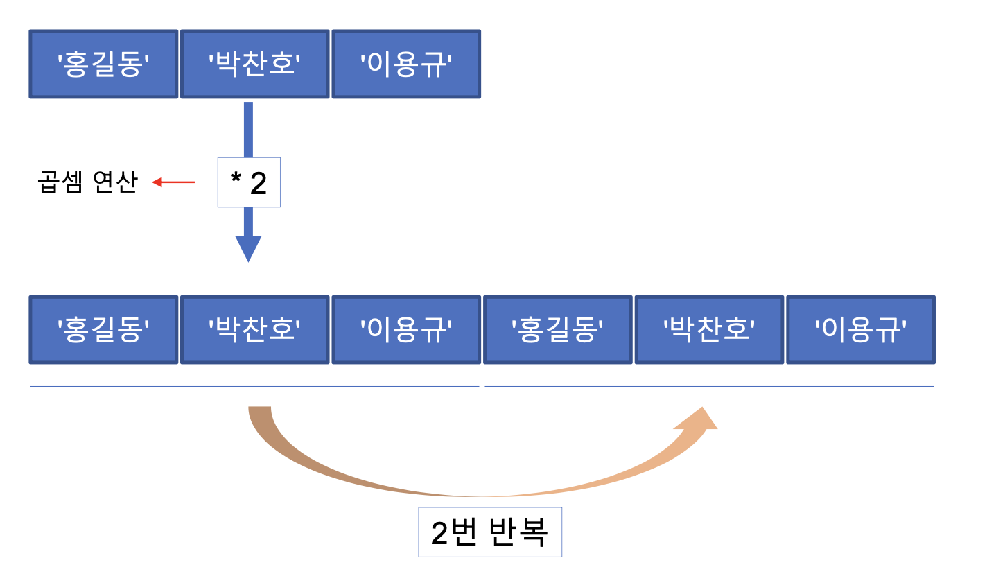 - 리스트를 곱셈 연산하면 아이템이 반복된다.