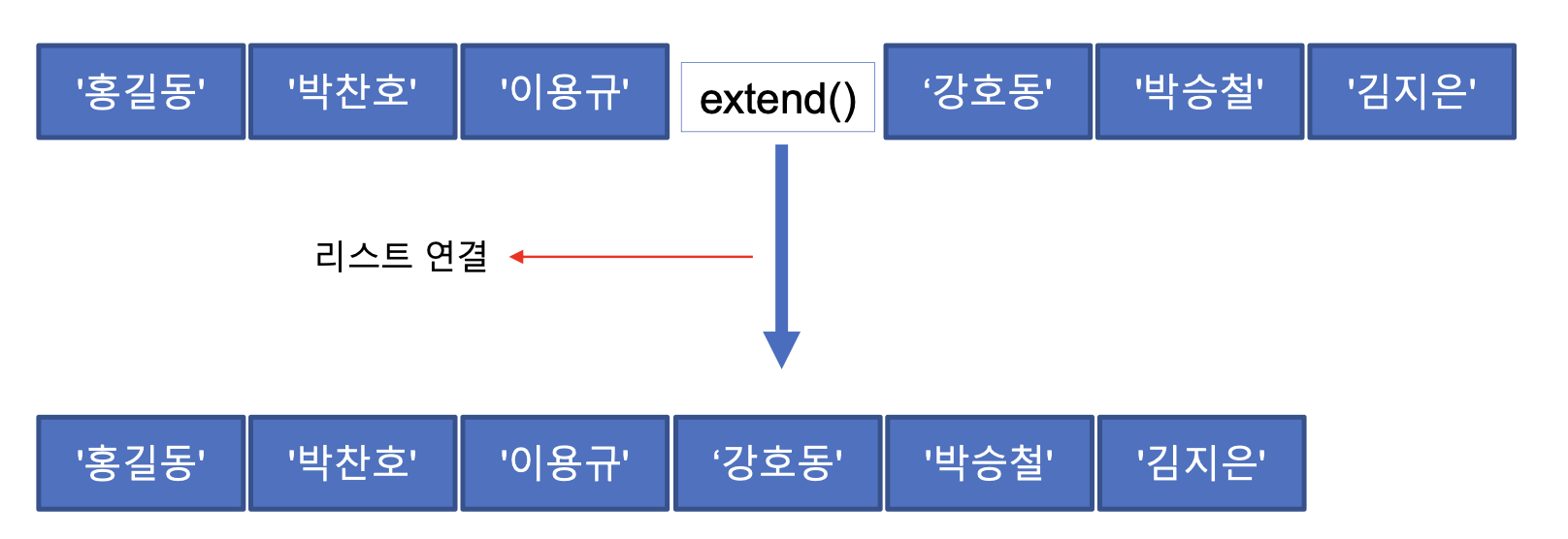 - extend() 함수를 이용하면 리스트에 또 다른 리스트를 연결(확장)할 수 있다. (list1)