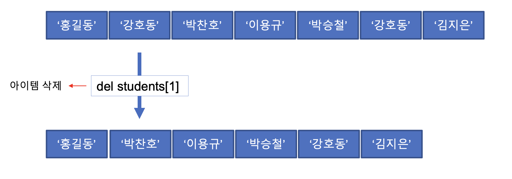 - del 키워드를 이용하면 특정 아이템을 삭제할 수 있다.