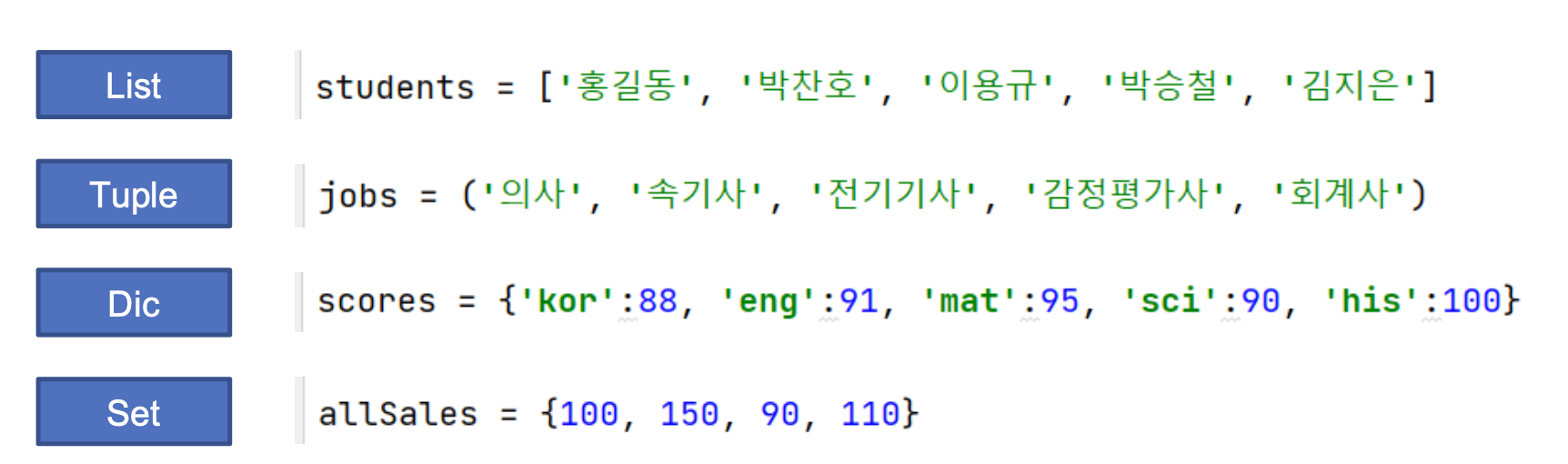 - 자료구조는 각각의 컨테이너 자료형에 따라서 차이가 있으며, 파이썬의 대표적인