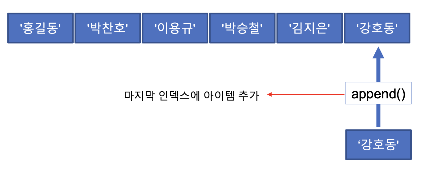 - append() 함수를 이용하면 마지막 인덱스에 아이템을 추가할 수 있다.