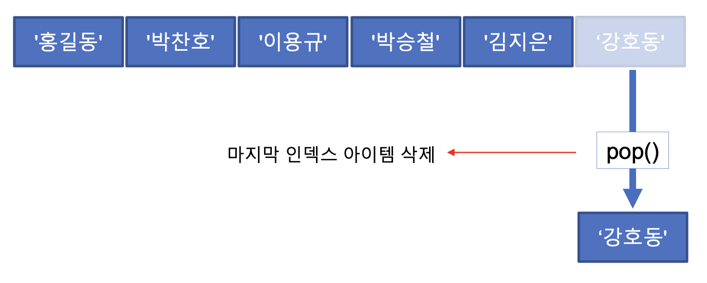 - pop() 함수를 이용하면 마지막 인덱스에 해당하는 아이템을 삭제할 수 있다.