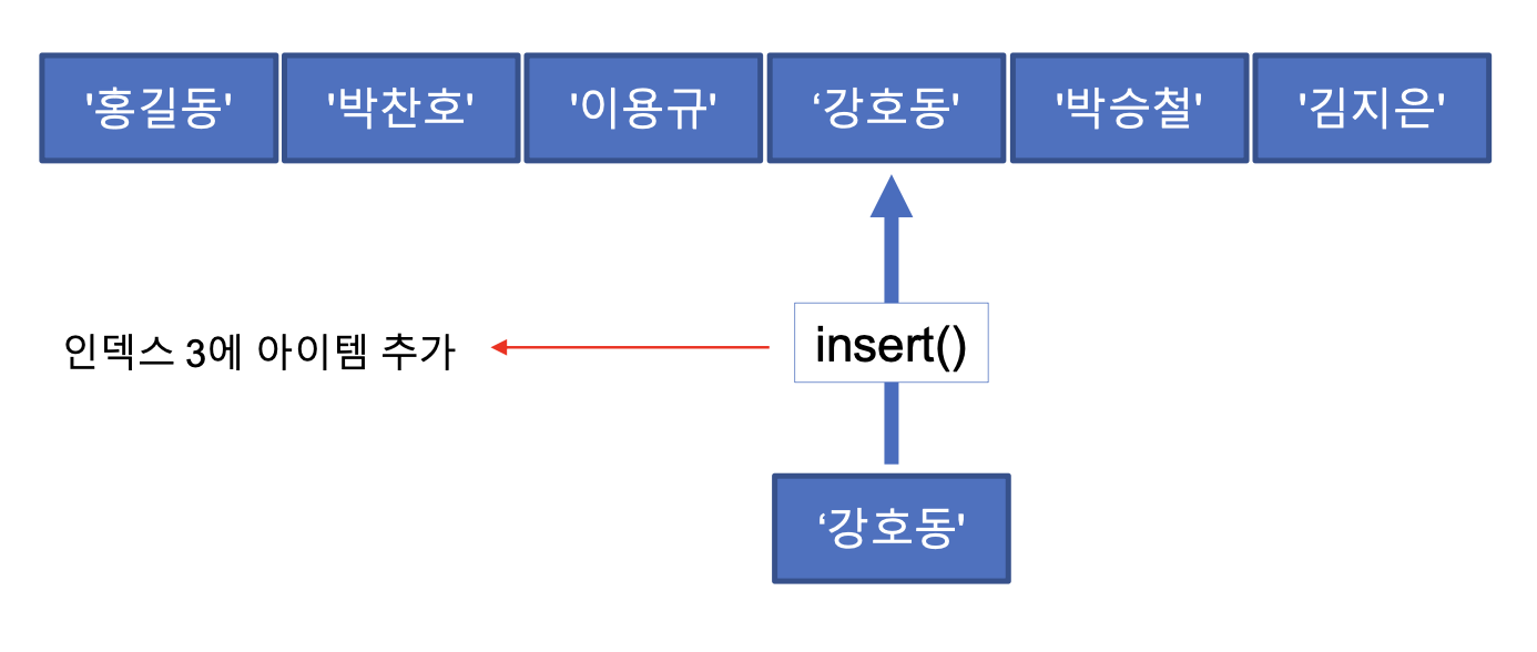 - insert() 함수를 이용하면 특정 위치(인덱스)에 아이템을 추가할 수 있다.