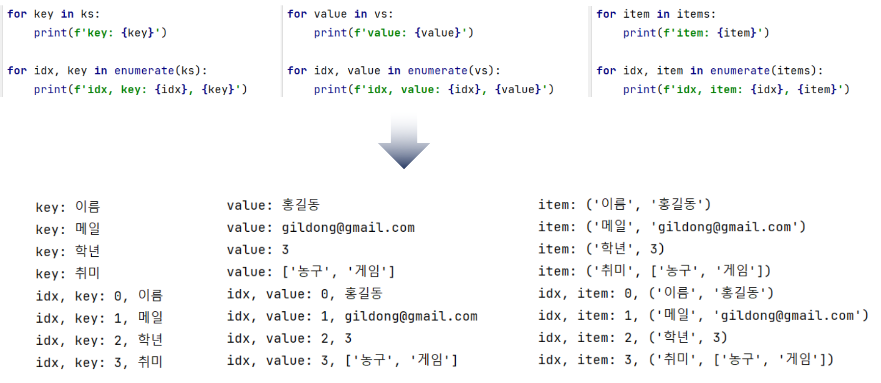 - 딕셔너리는 키(key)를 이용해서 값(value)을 조회한다.