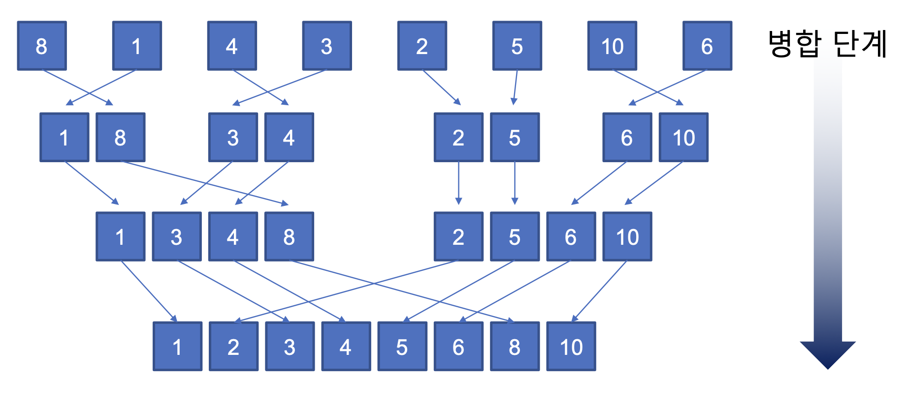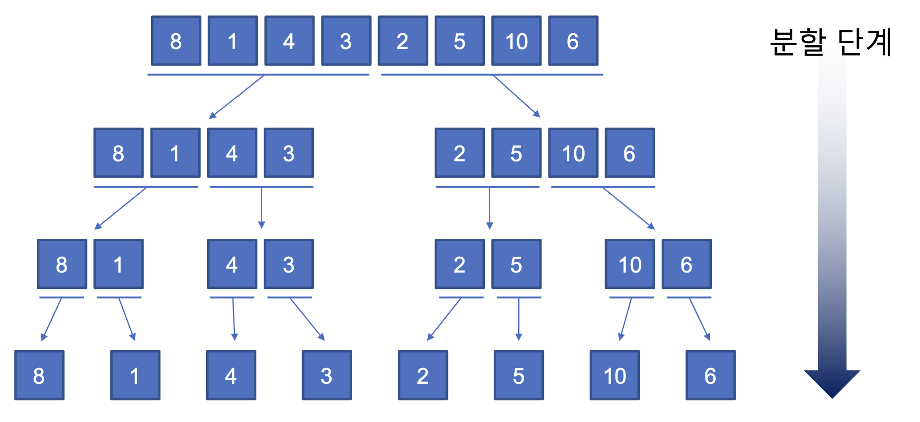 - 자료구조를 분할하고 각각의 분할된 자료구조를 정렬한 후 다시 병합하여 정렬한다.