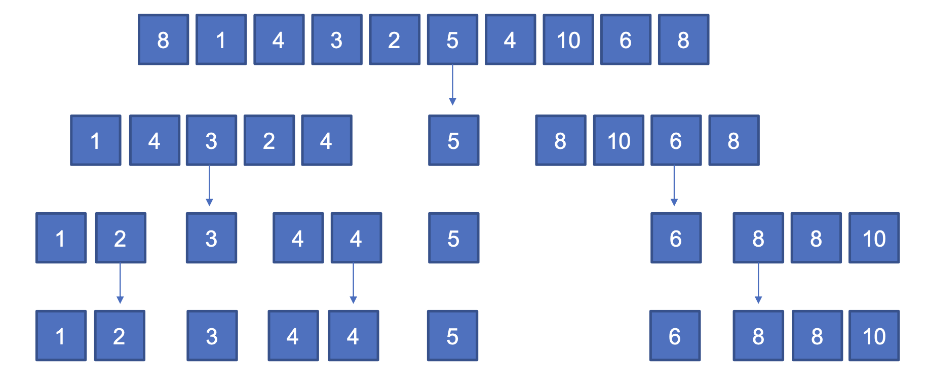 - 기준 값보다 작은 값과 큰 값으로 분리한 후 다시 합친다.