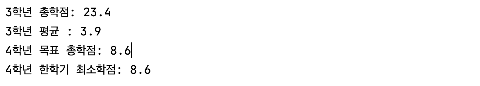 print(f'4학년 목표 총학점: {grade4TagetScore}')