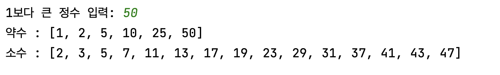- 1부터 사용자가 입력한 숫자까지의 약수와 소수를 리스트에 각각 저장하고, 이것을 출력하는 프로그램을 만들어보자.