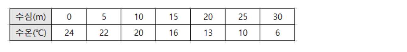 - 다음 표는 수심에 따른 수온을 나타내고 있다. 근사값 알고리즘을 이용해서 수심을 입력하면 수온을 출력하는 모듈을 만들어보자.