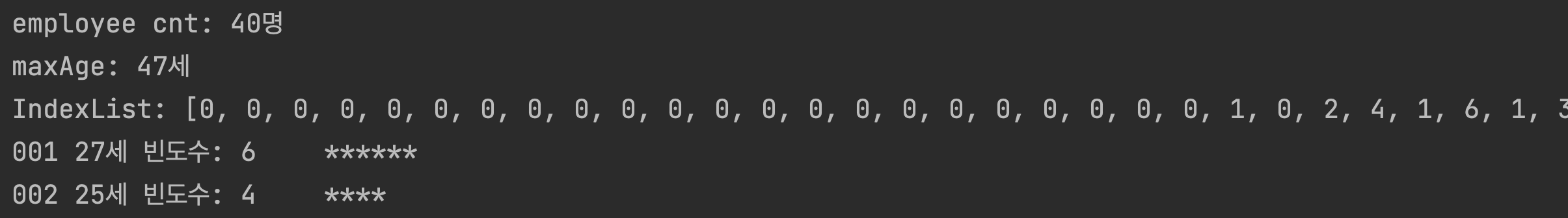 - 다음은 어떤 회사의 전직원 나이를 나타내는 리스트이다. 최빈값 알고리즘을 이용해서 나이 분포를 간단한 그래프로 출력하는 모듈을 만들어보자.