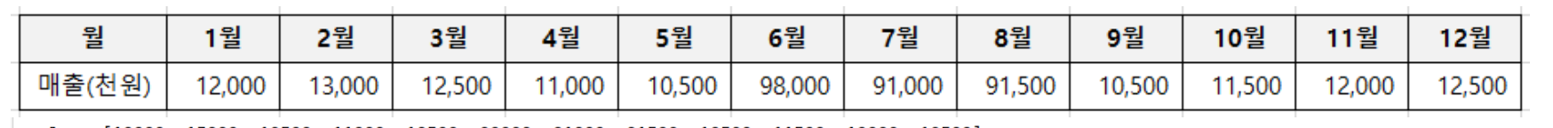 sales = [12000, 13000, 12500, 11000, 10500, 98000, 91000, 91500, 10500, 11500, 12000, 12500]