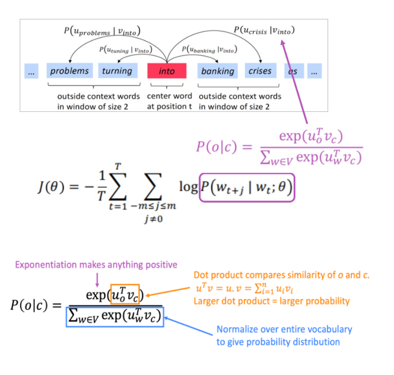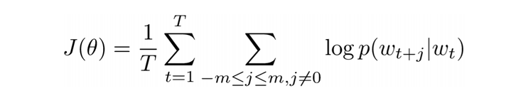 word vector 𝜽(parameter)가 주어졌을 때, window 내의 context word가 해당 위치에 나타날 확률의 곱입니다.