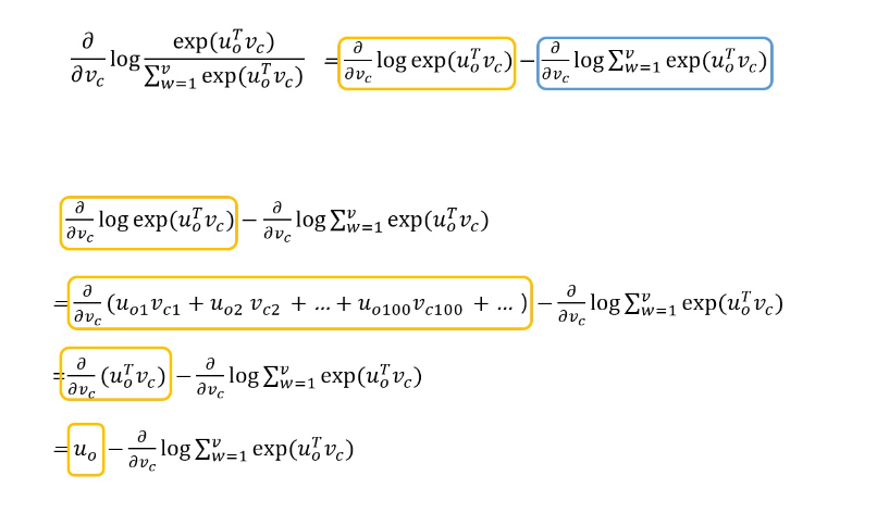 이 식을 center word, context word로 각각 미분합니다.