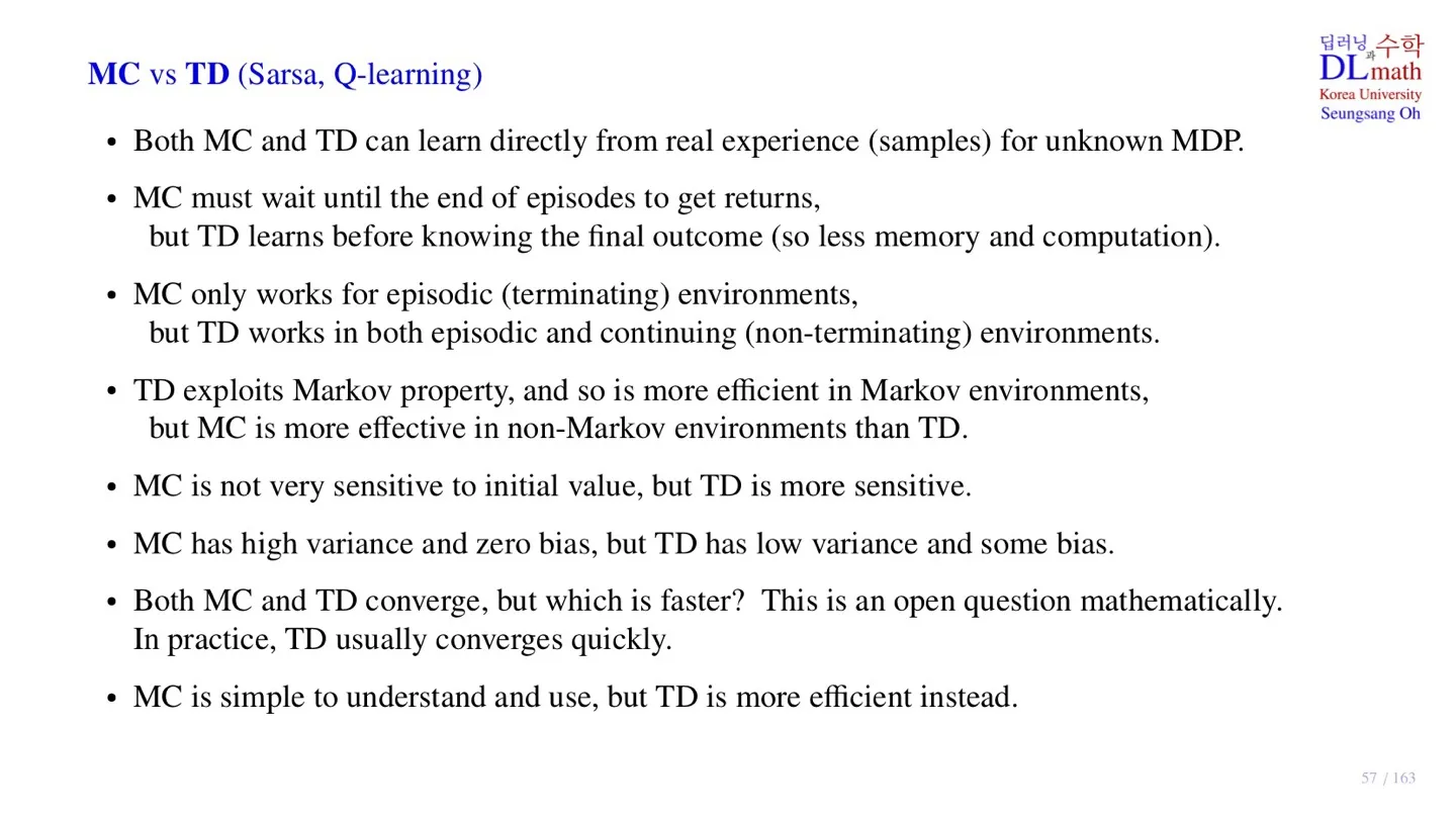 - Monte Carlo와 Temporal Difference를 Bias와 Variance 관점에서 살펴보았다.