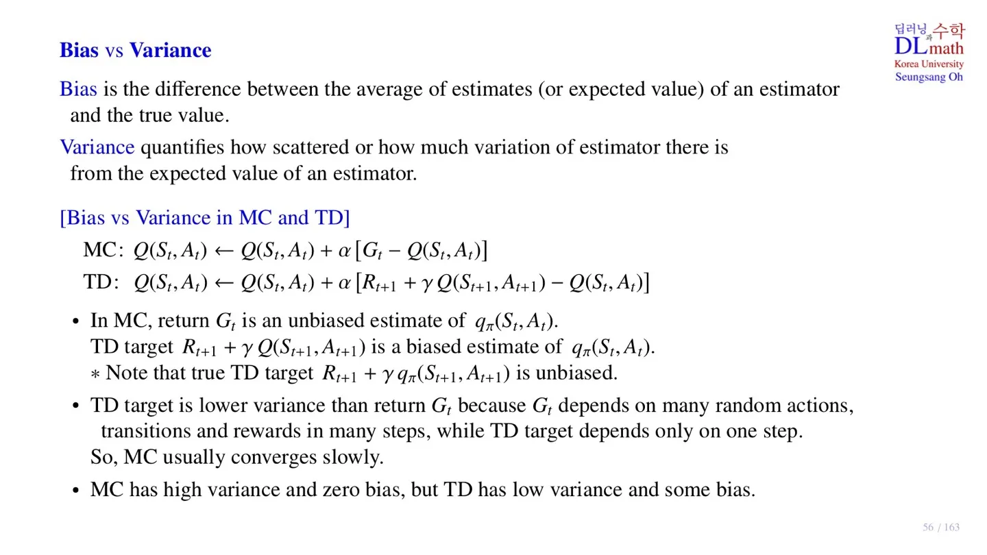 따라서 Rt+1+γqπ(St+1,At+1)는 qπ(s,a)의 biased estimate이다.