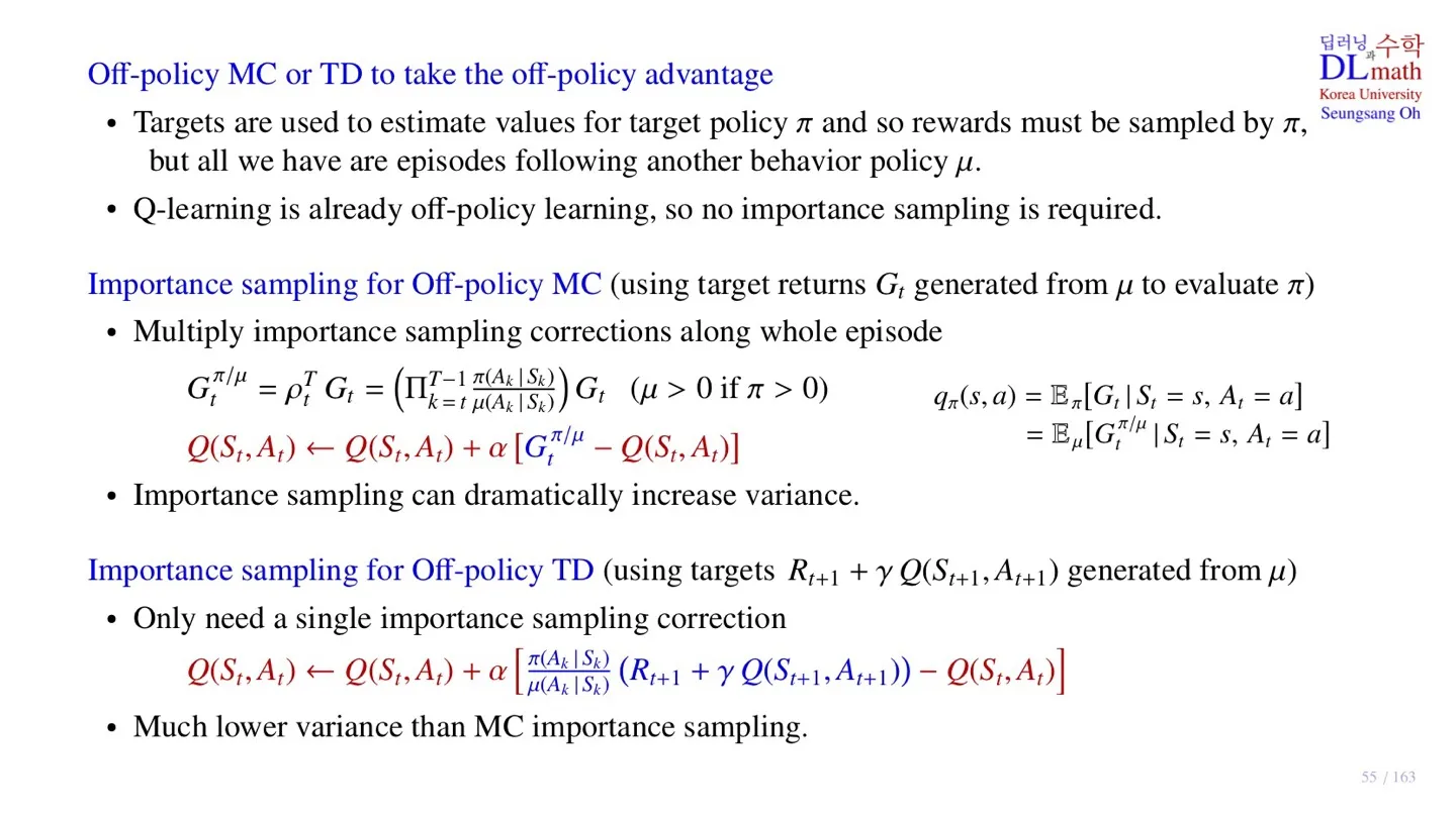 Q(St,At)←Q(St,At)+αμ(Ak∣Sk)π(Ak∣Sk)[Rt+1+γQ(St+1,At+1)−Q(St,At)]