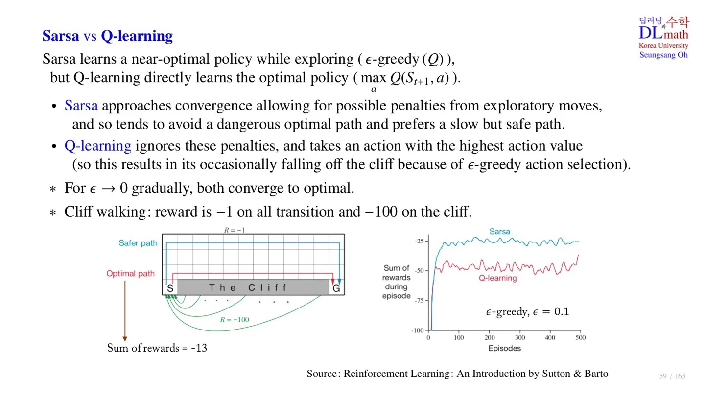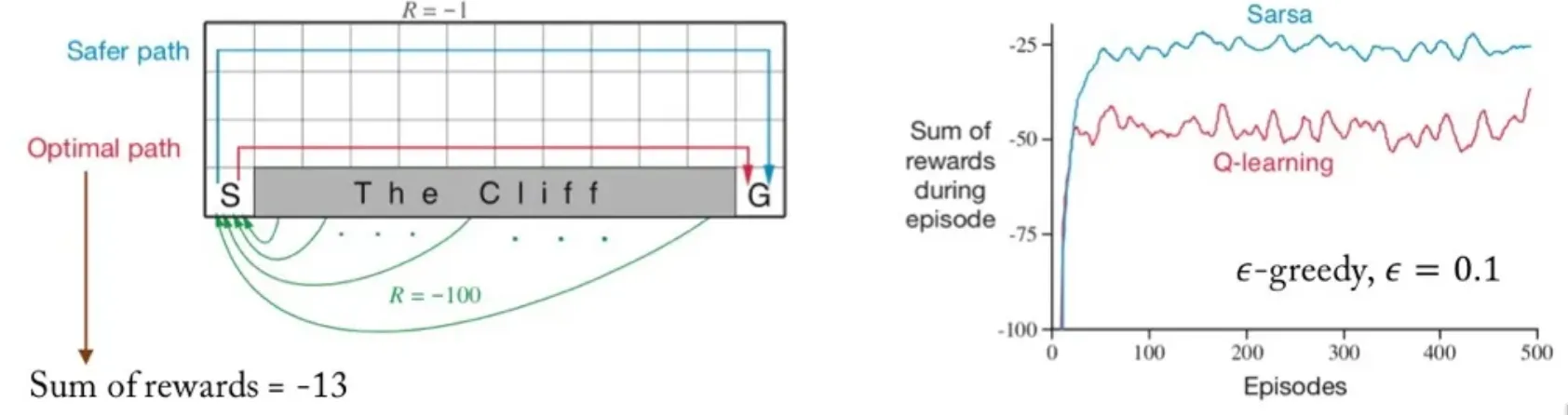 Cliff walking에서는 Sarsa가 Q-learning보다 더 좋은 성능을 보인다.