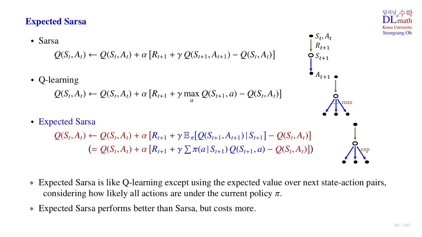 - Sarsa의 sample data만 고려한다는 한계를 극복한 Expected Sarsa에 대해 배웠다.