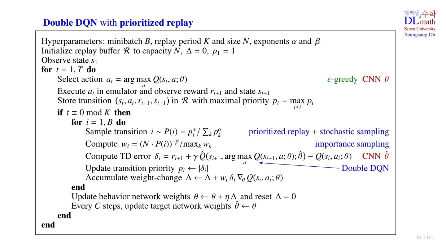 - Prioritized replay가 반영된 Double DQN의 pseudo code에 대해 살펴보았다.