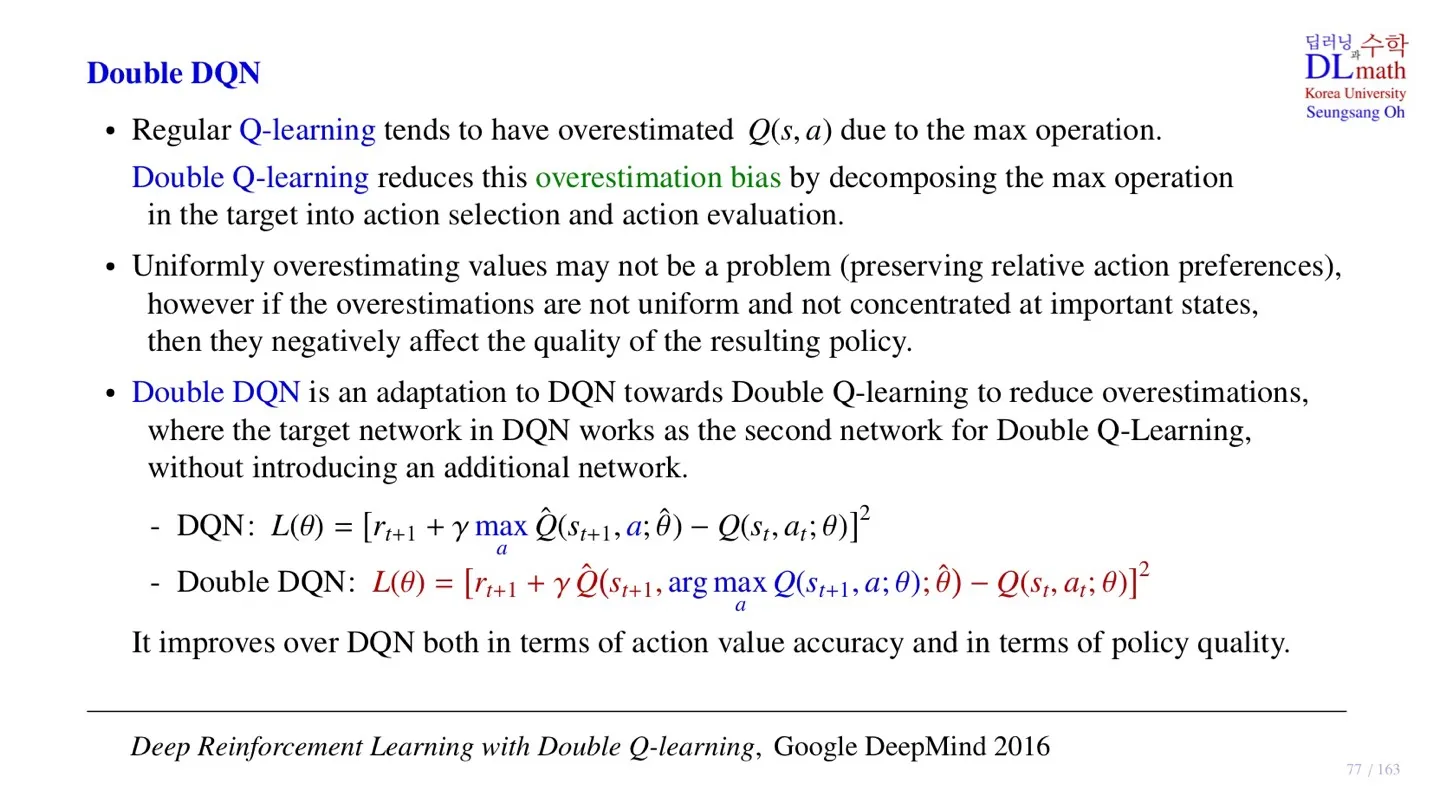 - maxaQ(S′,a)를 통해 Optimal action function을 선택하기 때문에 overestimated되는 경향이 있다.